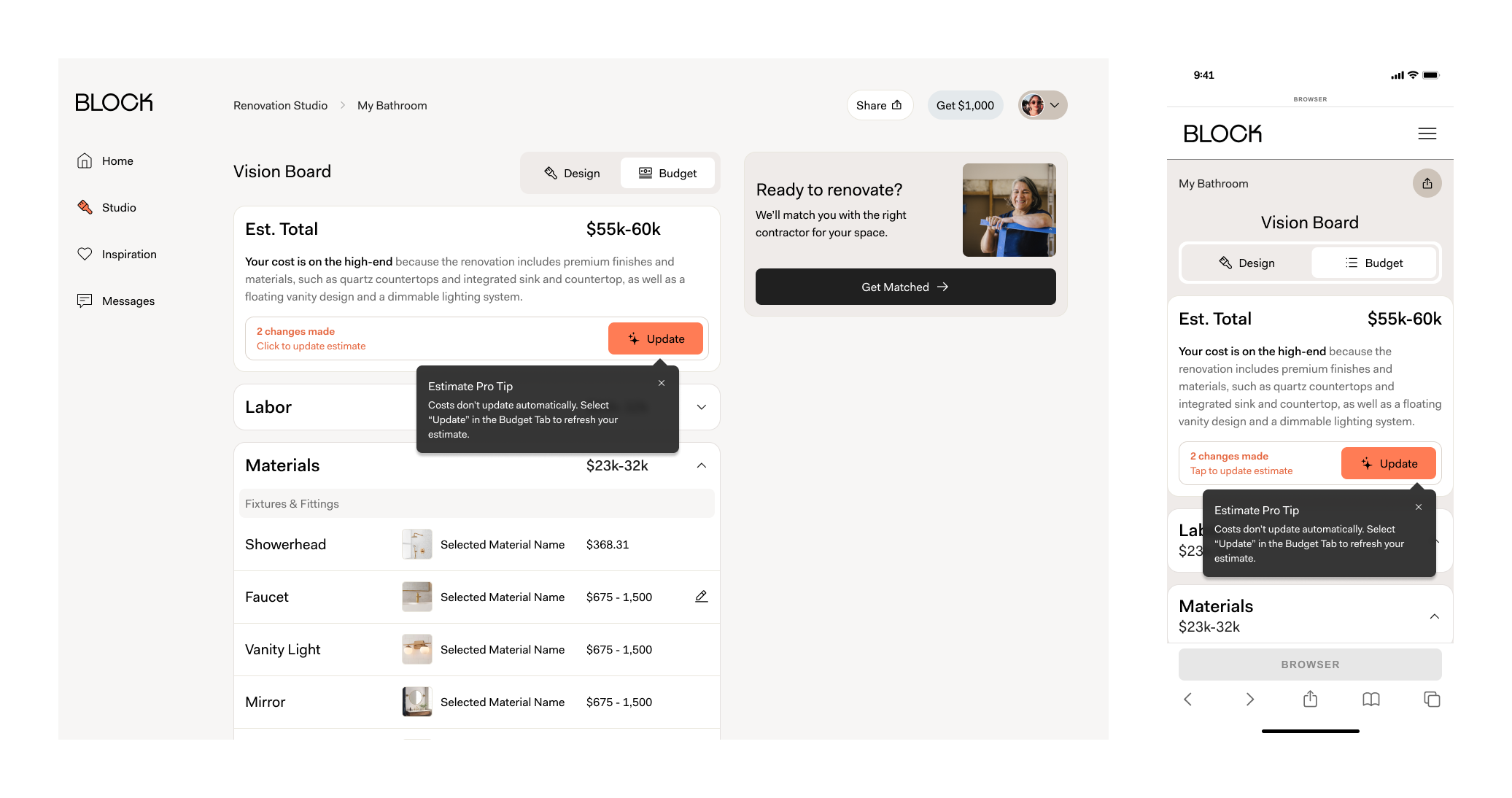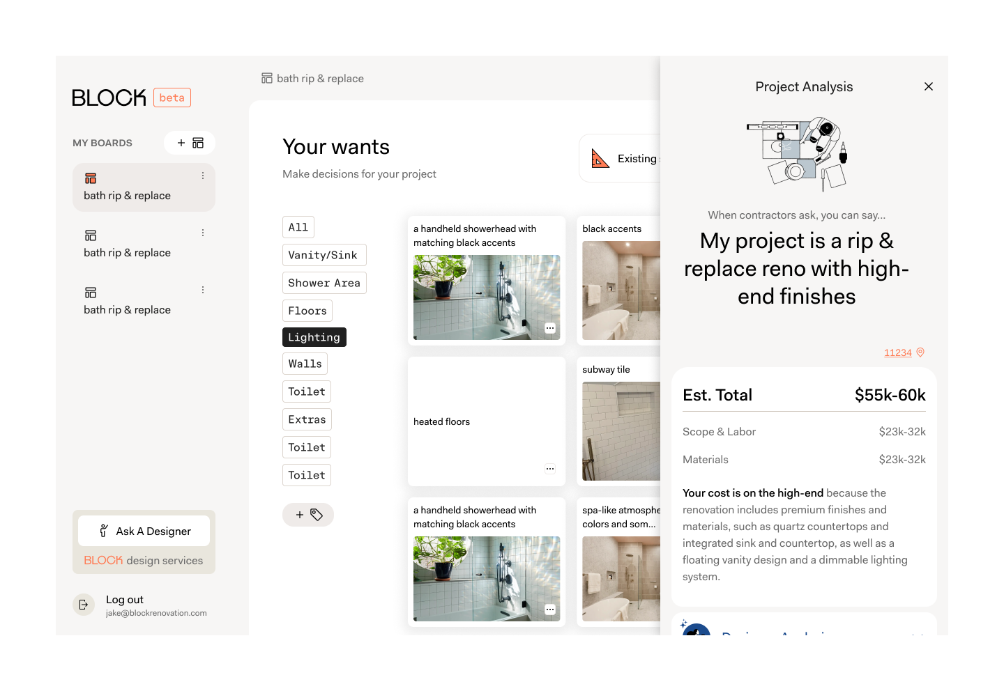 Context → Block Renovation helps homeowners renovate through vetted contractor matching. The challenge was not demand but delay. Renovations are high ticket and emotionally overwhelming decisions, and high intent homeowners were stalling before ever speaking to a contractor. Studio launched as a beta to test a clear hypothesis: if we reduce ambiguity early, we can accelerate commitment.